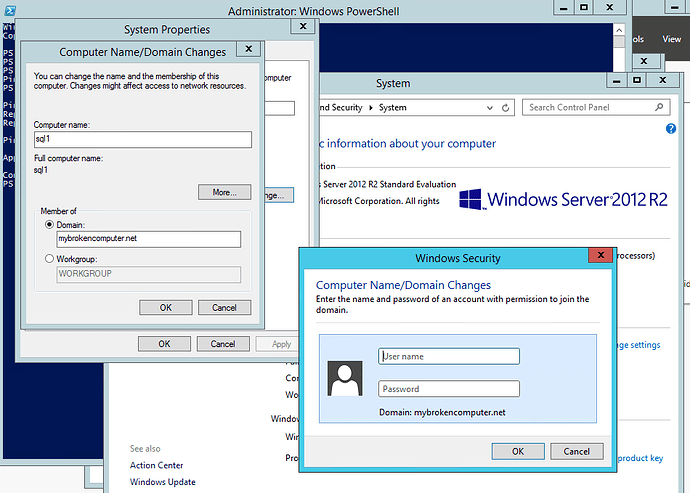 The first thing we need to do is get that SQL server on the domain. Again, we are starting with a very vanilla installation of Windows Server 2012R2. So, like any other machine, we join to the domain, and reboot.