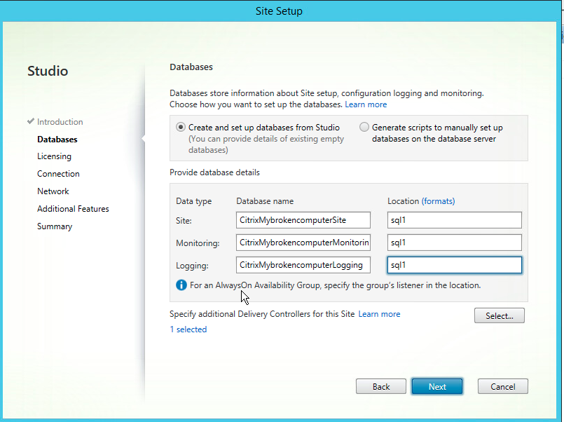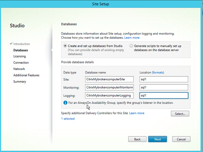 Now here comes the fun part, if everything we did during the SQL installation was successful, this part should be a breeze. We need to configure the three Citrix Databases. The site database, the monitoring database, and the logging database. We have two options available to use to make the SQL connection. We can do it directly from Studio if you have access to SQL, or you can generate scripts that can be manually run against the SQL server - this is usually done by a DBA in larger environments. For our purposes, we are gonna let Studio do the heavy lifting.