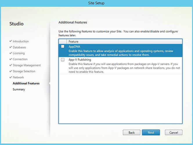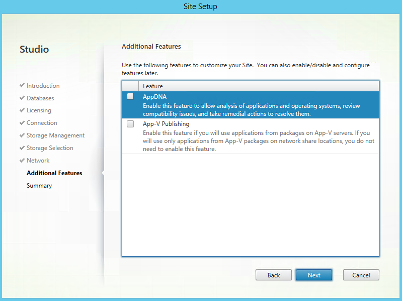 We then choose what additional features we would like to add. In our case, we are not going to be adding AppDNA (Enable this feature to allow analysis of applications and operating systems, review compatibility issues, and take remedial actions to resolve them) or App-V Publishing (Enable this feature if you will use applications from packages on App-V servers. If you will only use applications from App-V packages on network share locations, you do not need to enable this feature)