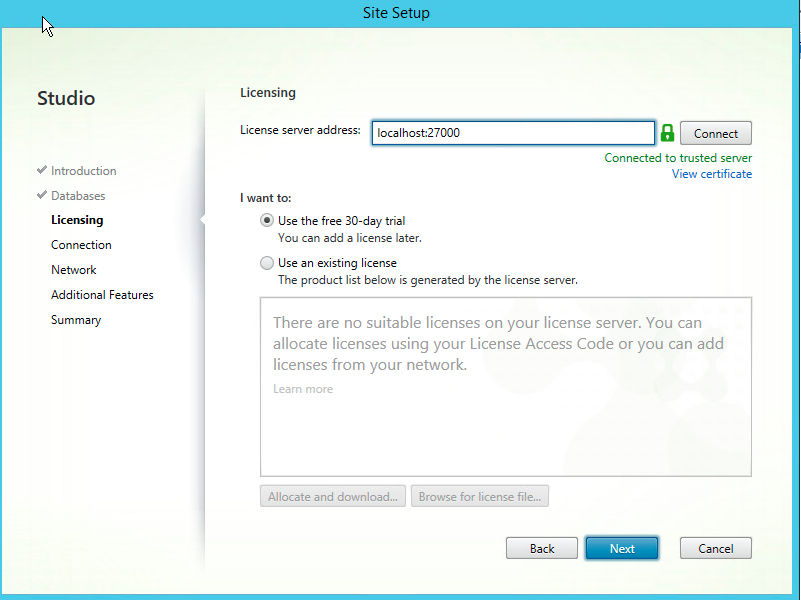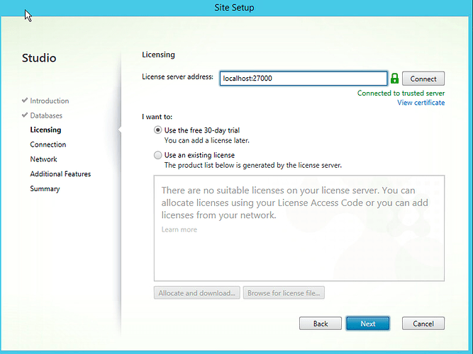 Assuming we have a successful connection to the SQL server, we are now asked to license the install. We are going to run with the default 30 day license.