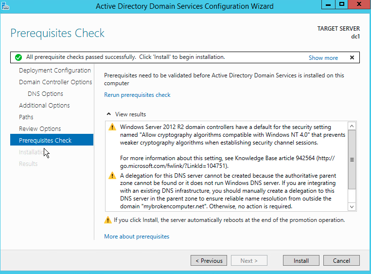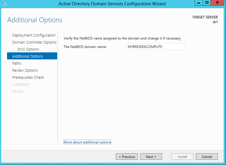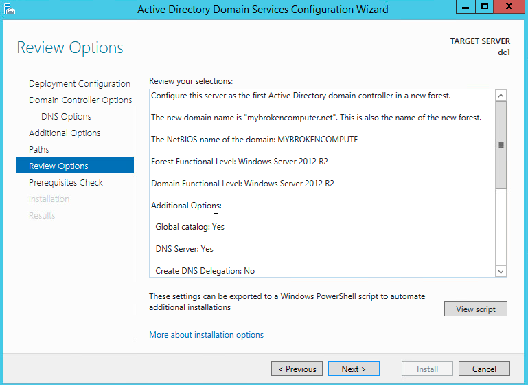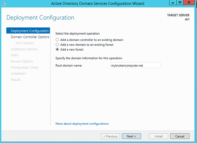 As this is a brand new lab deployment, you can see that we are creating a new forest called mybrokencomputer.net