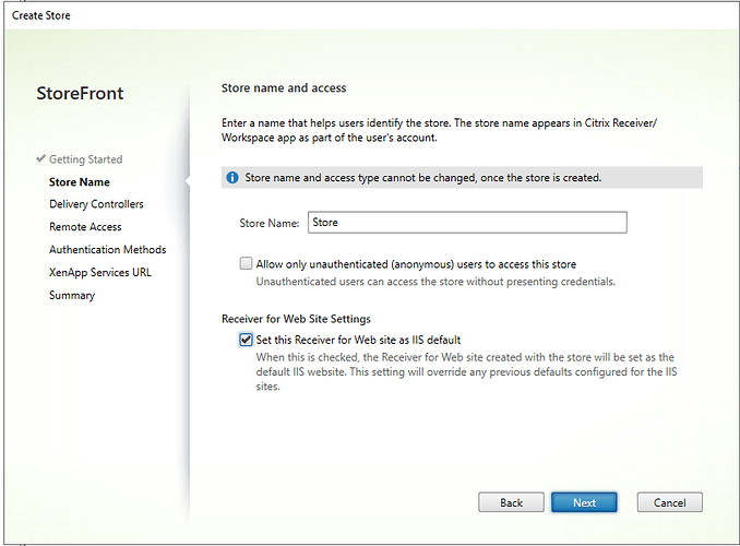 As this is our lab environment were gonna give it a creative name and call it “store” and we not going to allow unauthenticated users. We will also make this the default receiver for website in IIS