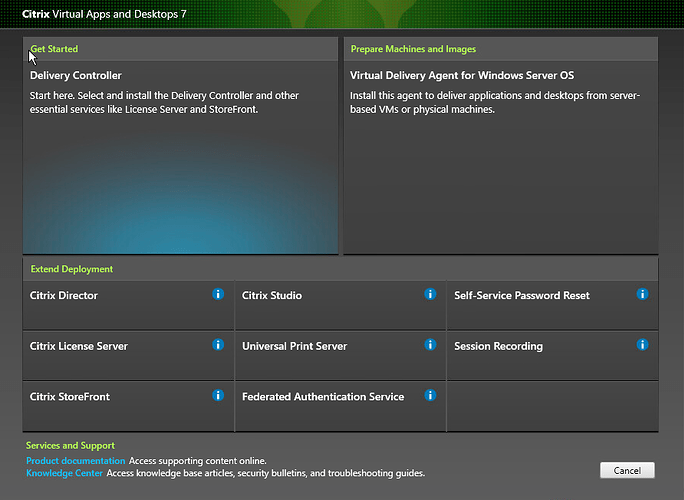 As my lab is running on VMware, I like to download the ISO to my local machine, and upload it to the datastore, so the VM will see it natively when we mount it as DVD/CD, and will be available each time the VM boots if the ISO file is still needed. Once we have the ISO mounted, the Citrix installer kicks off, with a new splash screen that I had not seen before.