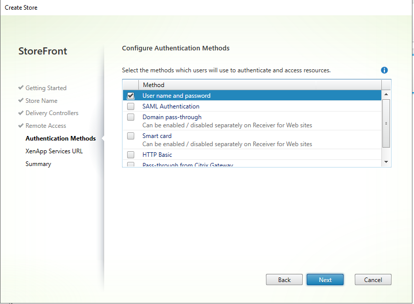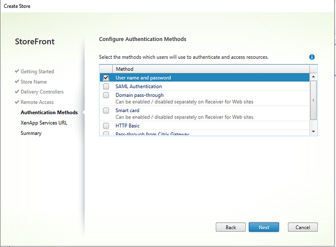 On the next screen we need to configure our authentication methods some of the methods available to was our street username and password SAML authentication tomane passed through smart card HTTP basic and pass through from Citrix gateway. We wil be using straight username and password here.