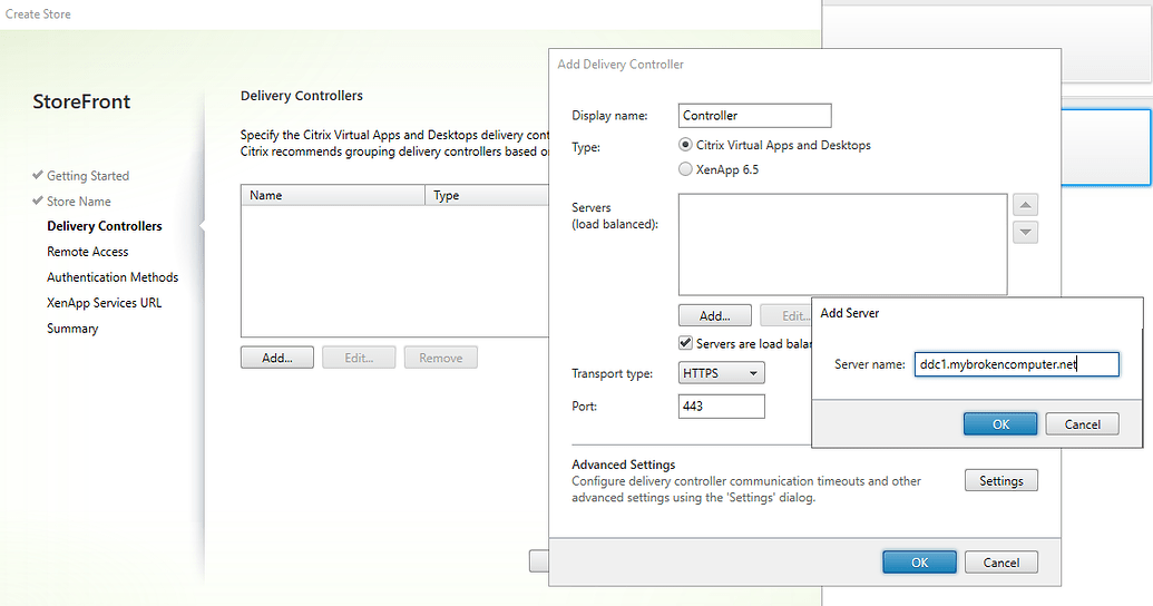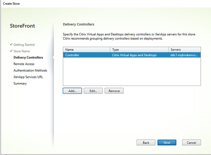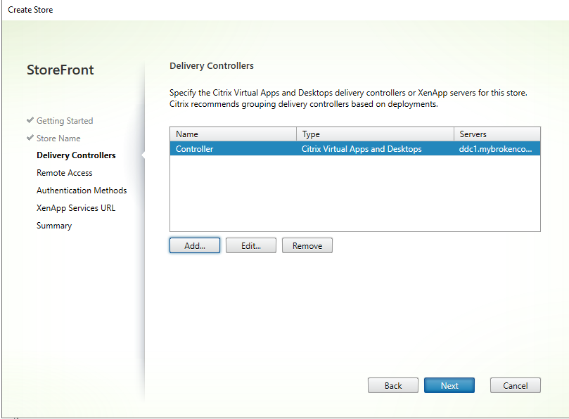 On the next screen we need to let Citrix storefront know about our delivery controllers. In it in our case we only have one controller so the configuration is very straightforward. We click on add, and give it the hostname of our delivery controller.