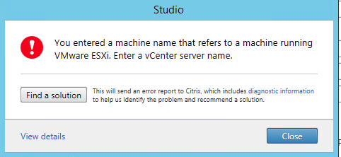 Citrix.Orchestration.Base.LogicModels.Exceptions.ConnectionNotVCenterException You entered a machine name that refers to a machine running VMware ESXi. Enter a vCenter server name.