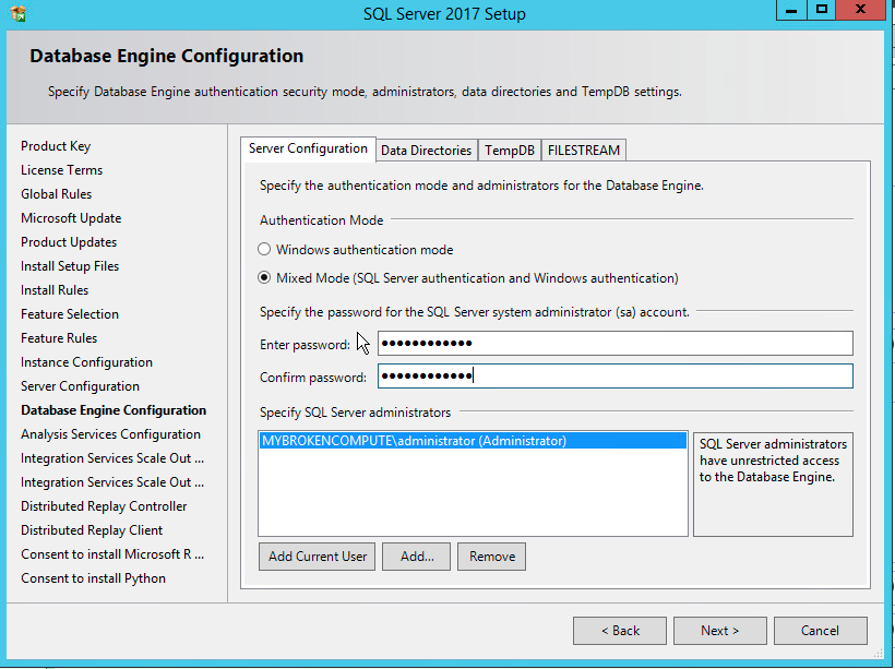 Now we need to tell SQL how/who can access the databases. I always like to use Mixed Mode (SQL Server authentication and WIndows Authentication), just in case anything happens the Active Directory environment, this will allow me to access SQL directly from SQL Server Management Studio