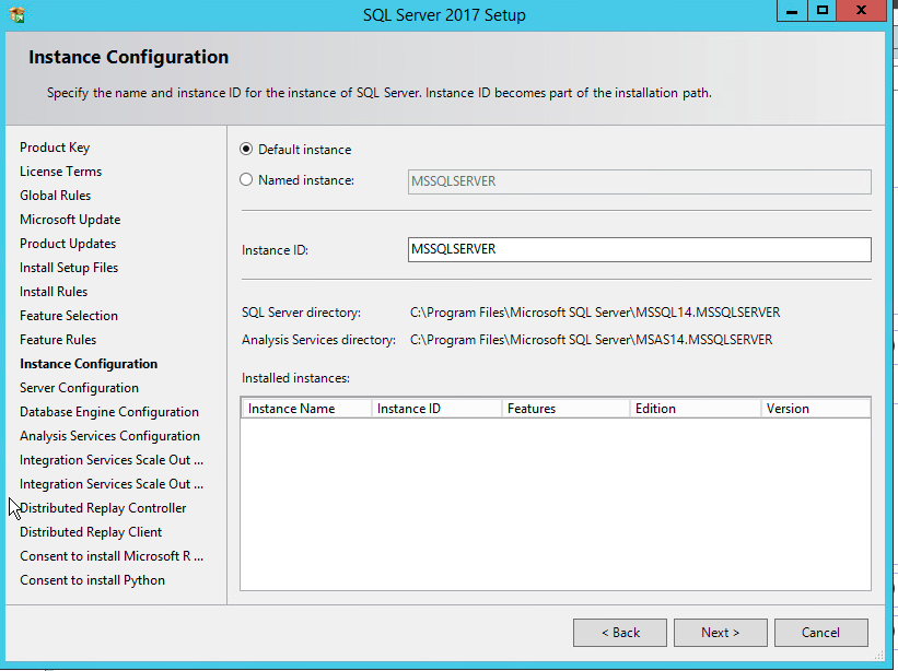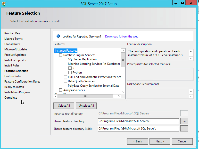 Again, this is a lab, so I install everything, and go with the default instance name of MSSQLSERVER