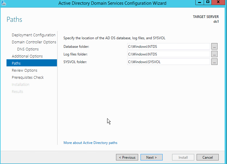 Here you need to set directories for the Active Directory DS Database, log files and SYSVOL directories. I highly recommend that you do NOT change these values in a lab. Remember the KISS (Keep It Simple Stupid) principal.