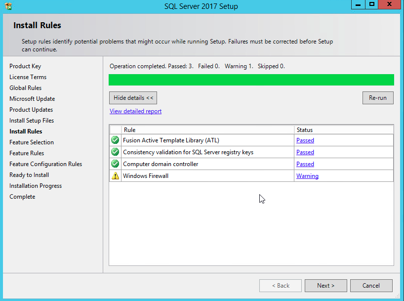 Once the latest version has been downloaded, we get an installtion health check to, which warns us of any issues that may impact the SQL install. In our case it is the local Windows firewall, which I will disable, as once again, we are in a lab.