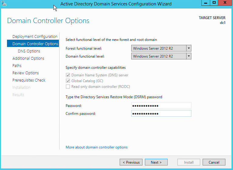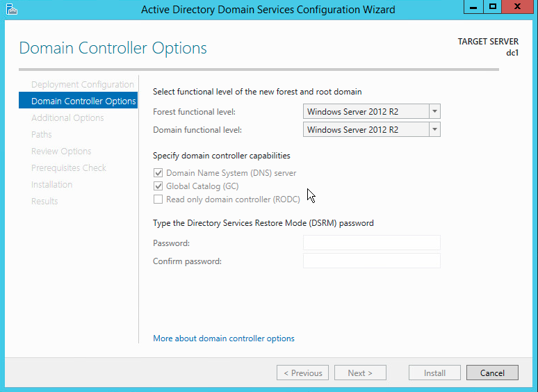 As we are running Server 2012R2, we are going keep the default functional level of our Active Directory installation at 2012R2