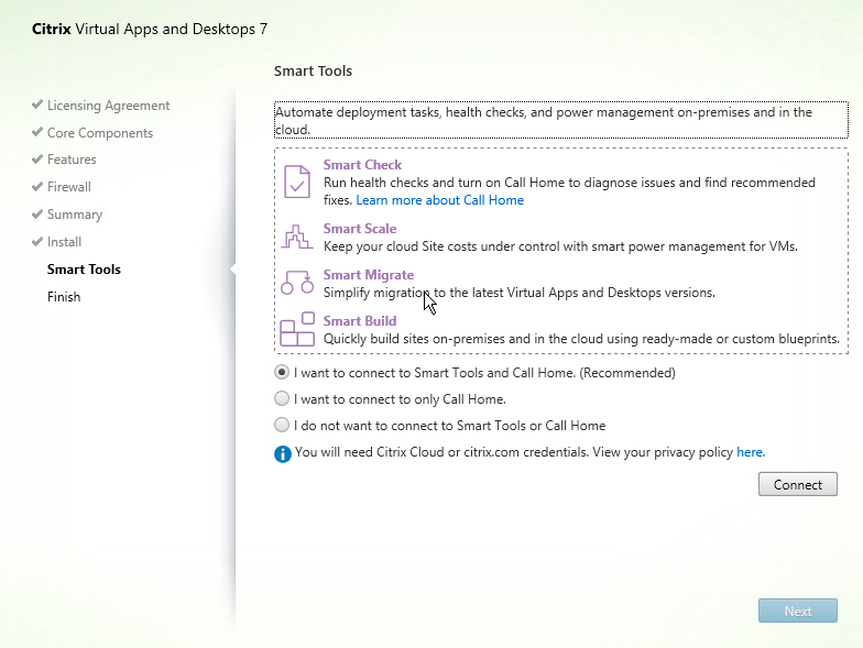 Towards the end of the install, we are asked if we want to participate in the Call Home program, and connect to Smart Tools. Again, this is a lab, so there is no need to do this. In production, I would use the Smart Tools function as it can be quite handy.