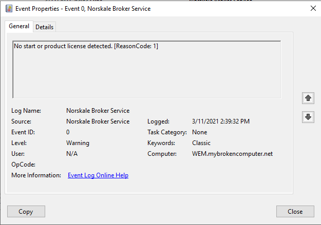 Into event viewer we go. And look what I found here. No where have I seen mention of any licensing, so time to dig some more.