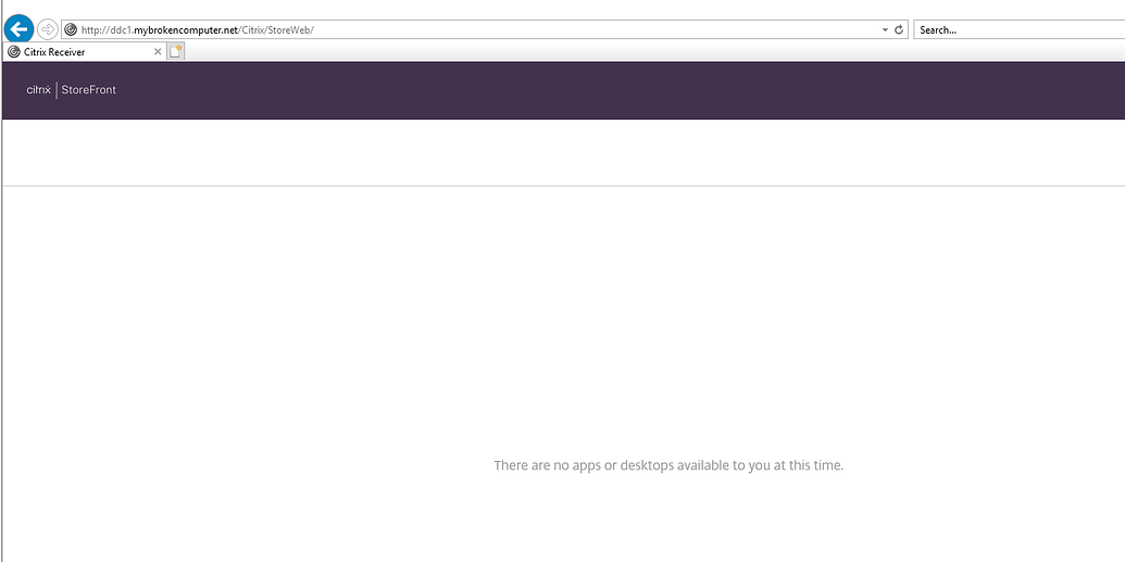Once you have entered your username and password, you should see an empty storefront server. This is normal, as we have not yet created our VDA devices. We will do that in the following steps.