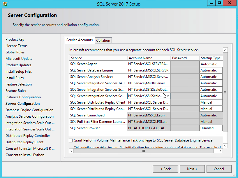 Next we need to configure the SQL service accounts. Default here is fine, as the core services will start up with the OS.