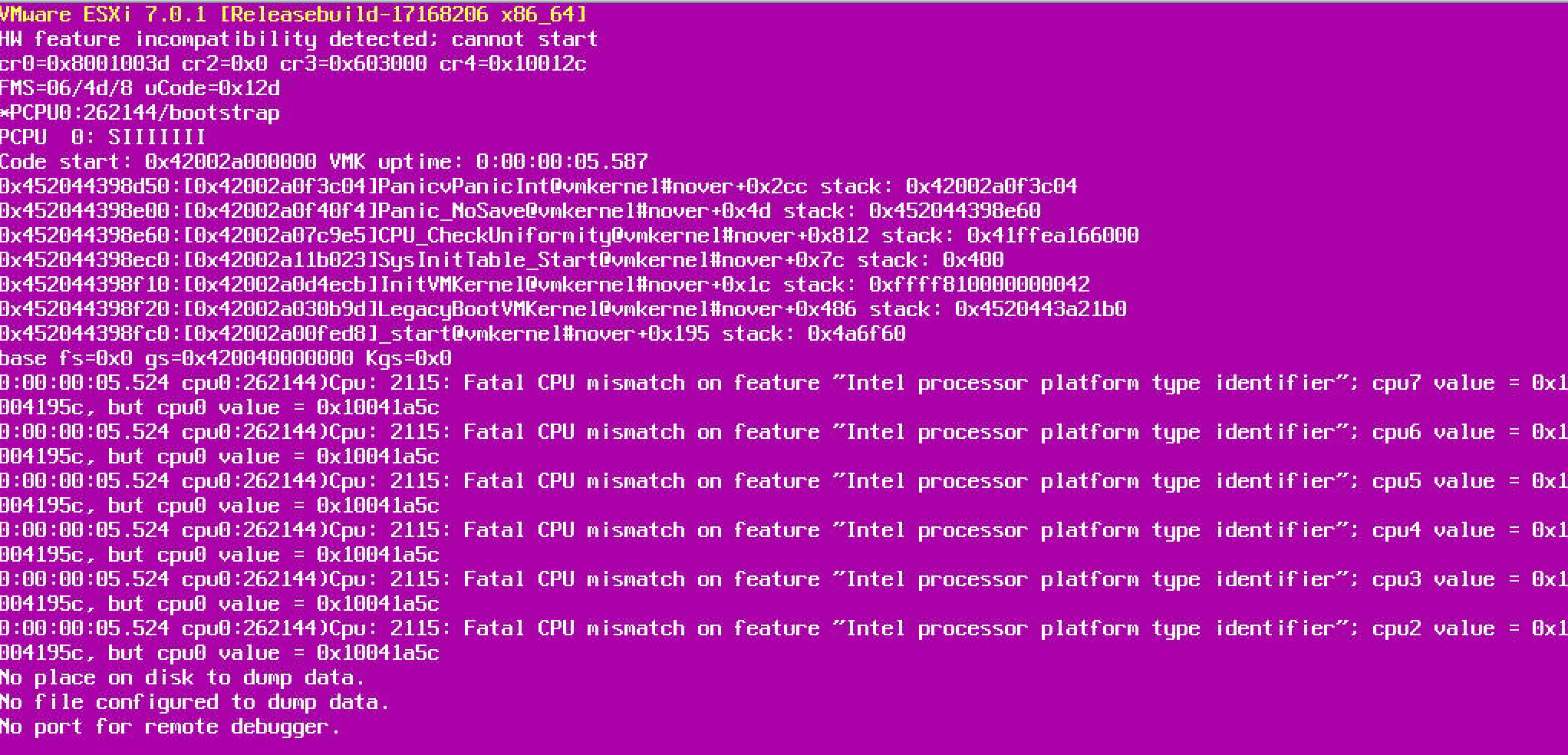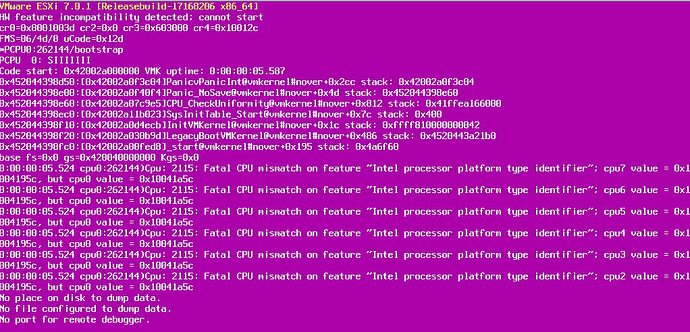 I boot from the USB key as normal, and the ESXi installer appears to load without issue, until BAM! The VMware Purple Screen of Death appears. Reading the error in the purple screen of death, it mentions fatal CPU mismatch.