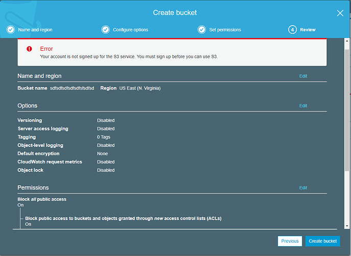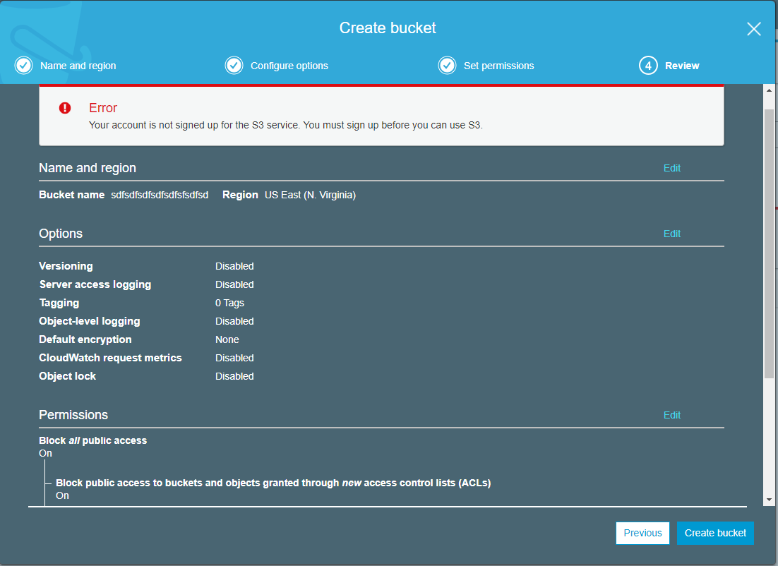 This is not a brand new AWS account, so what is going on! To see if it is a phantom error, I attempted to create a new bucket in US-East-1.